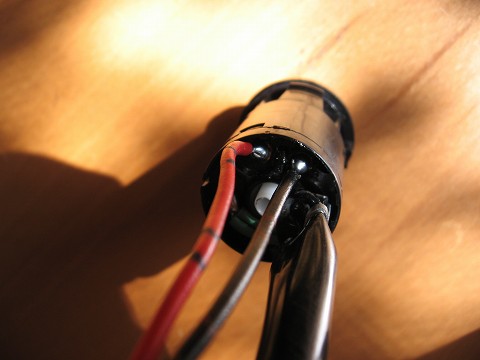 キーシリンダの空いてる2カ所の接点にキットに付属の赤色、黒色の線をつなげます。
