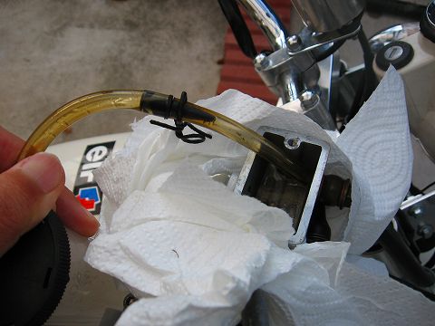 キャリパーのブリードバルブにビニールチューブを繋げ、残りのブレーキオイルを下から吸い出しました。