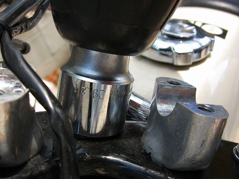 トップブリッジを外したいので、ステアリングステムナットを外します。29mm使ってますね。