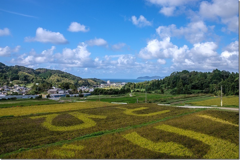 上の赤米は違う場所ですが、9/15~9/25くらいが糸島 二条の赤米も綺麗です。今年はなんと言う文言が田んぼに描かれてるのかな?
